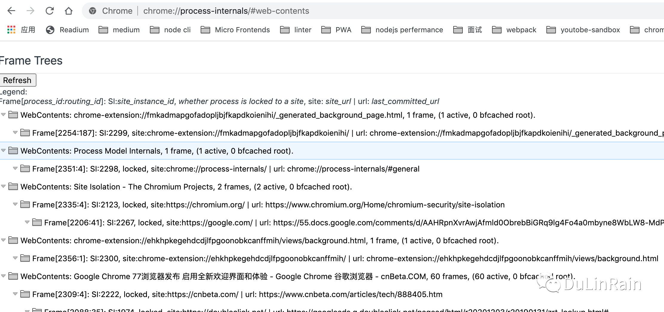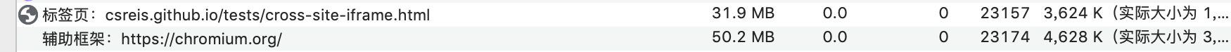 如果你在Chrome任务管理器中看到了子frame,证明站点隔离被正确的开启了。当使用隔离所有站点(即--site-per-process)方式时上面的步骤会奏效。在隔离特定站点(--isolate-origins)模式下,如果对应列表中包含 http://csreis.github.io 和 https://chromium.org 这2个域名的话,上述步骤也会生效。
